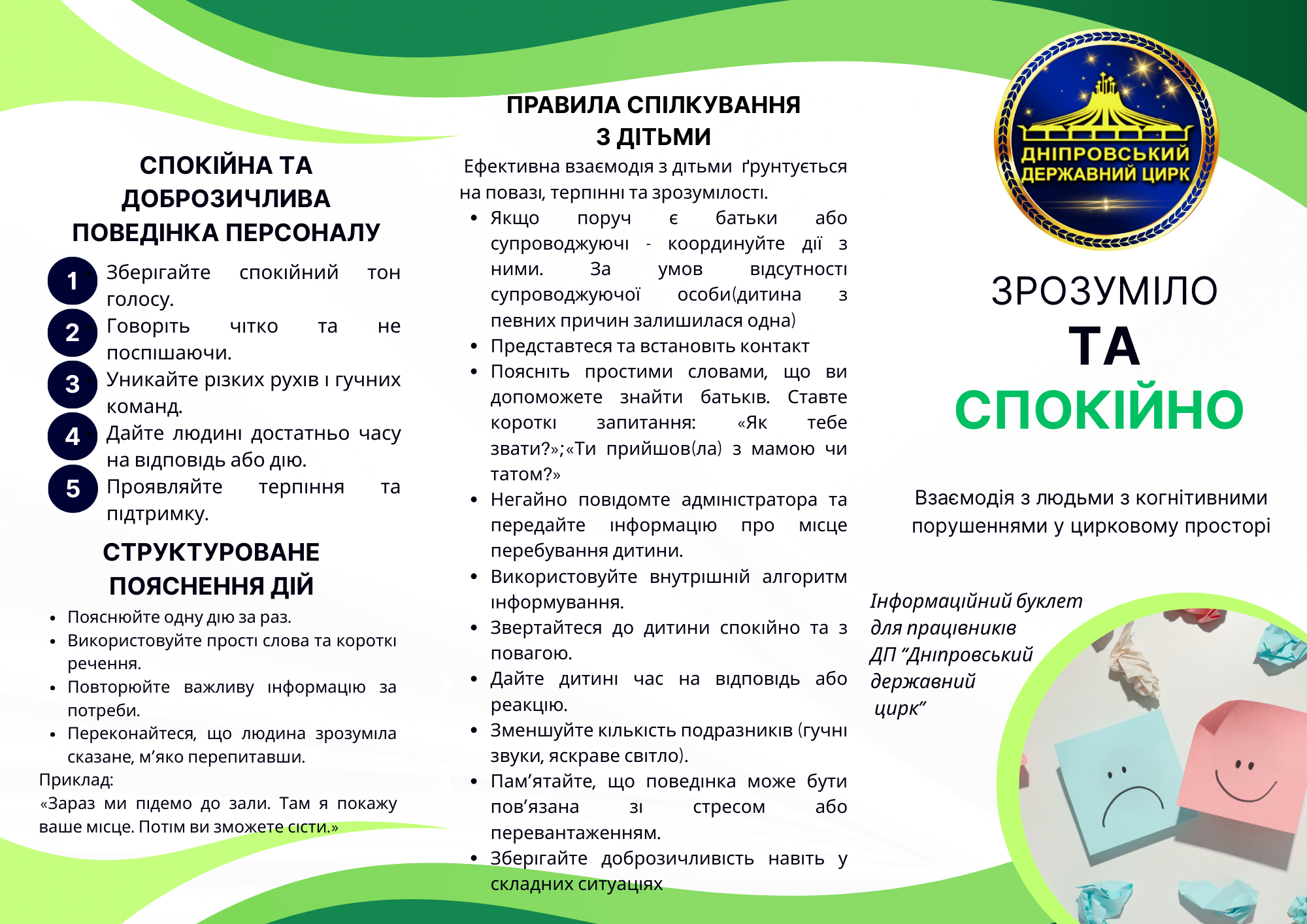Буклет допомагає краще розуміти потреби відвідувачів та навчатися спілкуватися спокійно, чітко й з повагою, створюючи безпечний і комфортний простір.