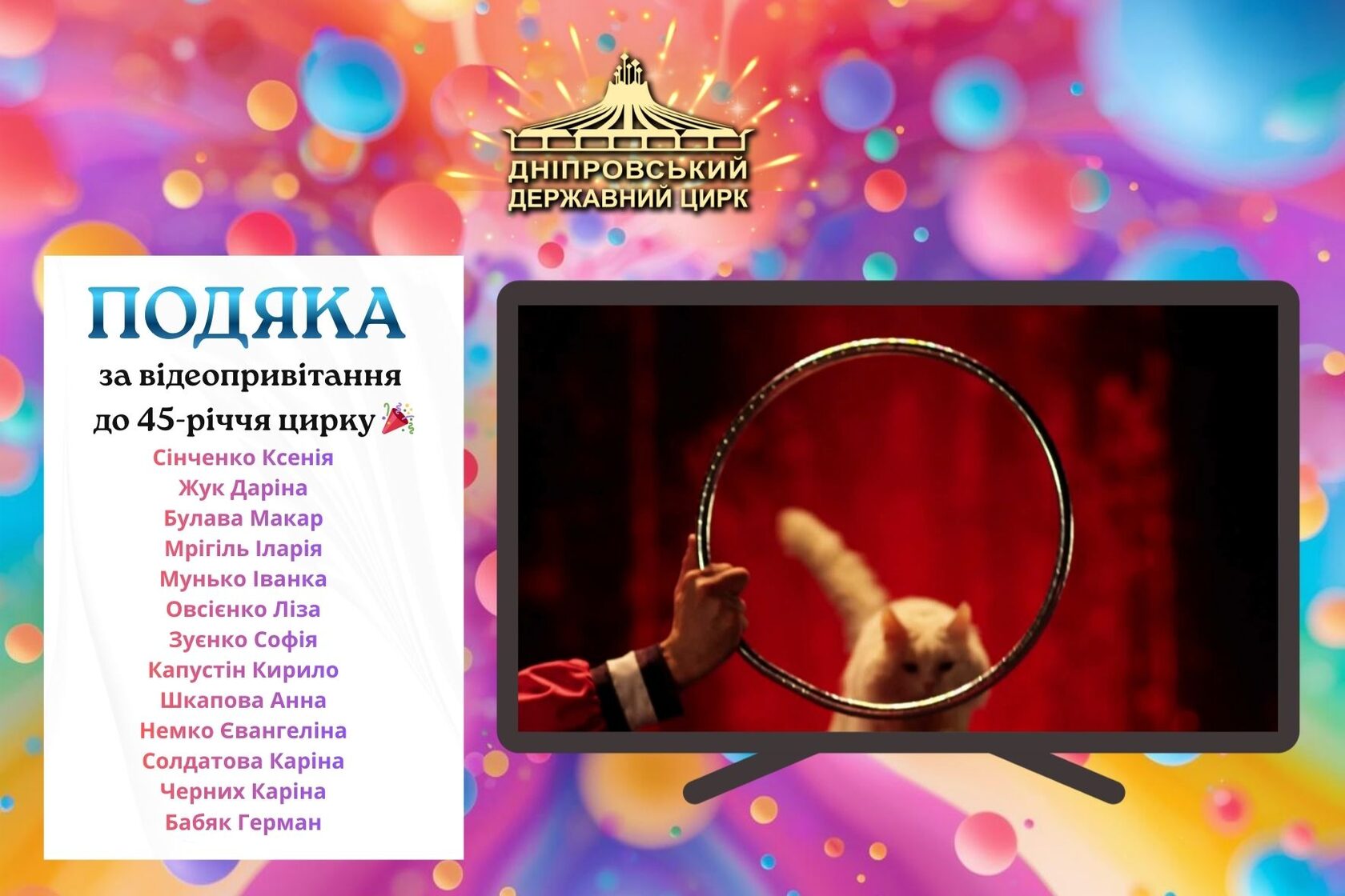 Від усього серця дякуємо Вам за чудові, щирі та натхненні відеопривітання до 45-річчя цирку 🎉 і даруємо кожному подарунковий сертифікат❗️